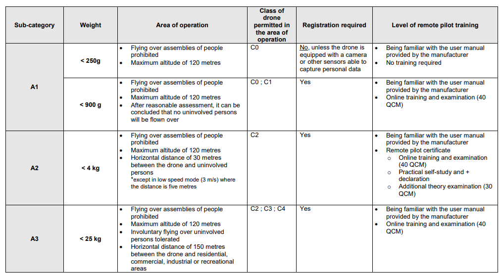 The categories for the operation of drones